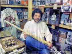 Avid collector: Terry Bertolino sits in the basement of his Union home with some of the House of David baseball memorabila. Bertolino recently co-authored a pictorial book about the Benton Harbor-based phenomenon.